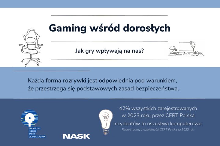 O czym należy pamiętać zarówno przed korzystaniem z gier jak i będąc uczestnikiem wirtualnej rozgrywki? Odpowiedzi można zaleźć w cyklu NASK: “Gaming wśród dorosłych.”